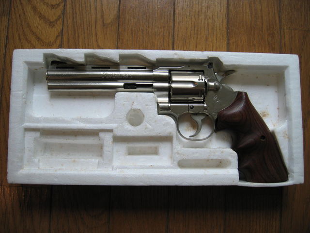 今回はコクサイの名作、ニューコルトパイソン旧タイプ。このモデルは確か80年代後半に発売されたモデル。前作コルトパイソンはリアリティーの面ではいまひとつだったこともあり、「リボルバーのコクサイ」が面子をかけて(私の想像)リニューアルしたもの。