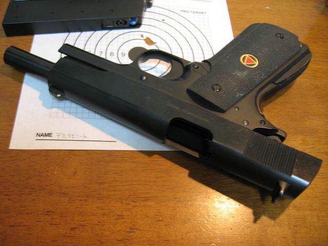 限定品ということで、発売日に渋谷の直営店に買いに行ったけど、その後セールの対象になっていたり、中古品が出回っていたりと、あまり人気がなかったようだ。実射性能だけど、ブローバックはマルイに比べて鋭いが、いかんせん命中精度が芳しくない。私の個体の問題か私の腕の問題か、5mで7cmに広がってしまった。何回撃っても同じような結果になる訳で・・・。マルイのMEUピストルに慣れちゃうとやはりお蔵入りとなってしまった。