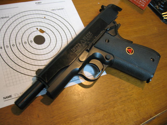 デルタエリートとは、一見、ただのガバメント(アメリカでは単に「1911」と呼ぶようだ)だけど、このモデル最大の特徴は、使用弾が45口径ではなく特殊な弾丸である10mm弾を使用することにある。これをモデルアップしたのがWAでSCW2という一世代前のモデルだ。東京マルイに比べてリアリティや反動は良いが命中精度が芳しくない。個体差なのかもしれないが。
